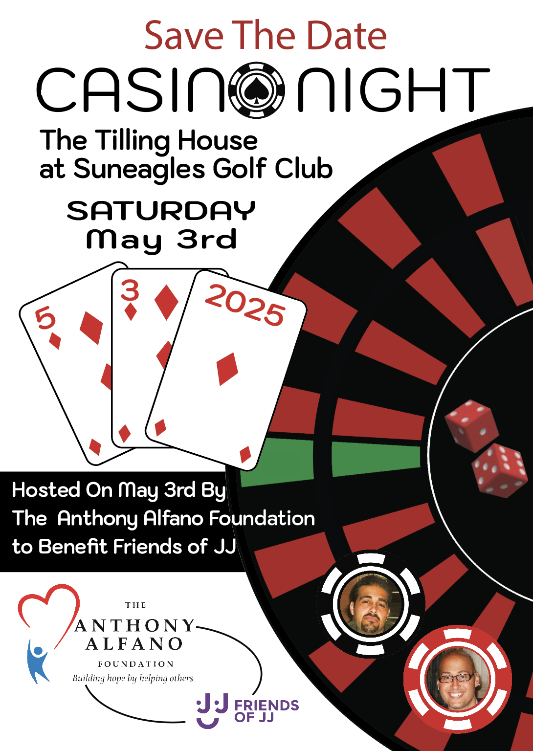 We are excited to invite you to a Casino Night Fundraiser, hosted by The Anthony Alfano Foundation to benefit Friends of JJ. We hope you will join us on Saturday May 3rd at the Tilling House at Suneagles Golf Club for an evening of casino games, raffles, silent auction, dinner, dancing and cocktails. This event will support two wonderful foundations honoring the memory of two amazing men. We are so grateful for the Alfano Family and their support of our mission. Anthony helped our organization before he was diagnosed with cancer, during his battle, and now his family is continuing in his honor.